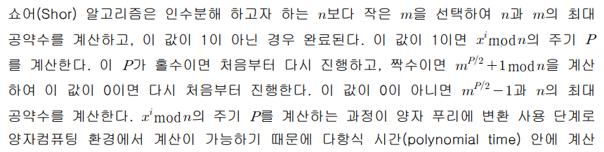 - 쇼어 알고리즘 (Shor's Algorithm):