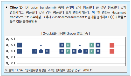 양자 컴퓨터는 기존 고전 컴퓨터보다 빠른 계산 속도를 제공하여 양자 컴퓨팅 환경에서 는 양자 기반 알고리즘인 쇼어(Shor) 알고리즘과 그로버(Grover) 알고리즘이 현대에서 많이 사용되는 공개키 암호 시스템에 큰 변화를 가져오게 된다. 그로버(Grover) 알고리즘 은 정렬되지 않은 데이터베이스의 원소를 검색하는 속도를 향상시켜 대칭키 암호와 해시 함수에 영향을 준다. 쇼어(Shor) 알고리즘은 인수분해 문제 해결 시간을 감소시켜 RSA 암·복호화, RSA 서명, 디피-헬만(Diffie-Hellman) 키 교환 등 여러 공개키 암호 알고리즘 을 사용할 수 없게 만든다.