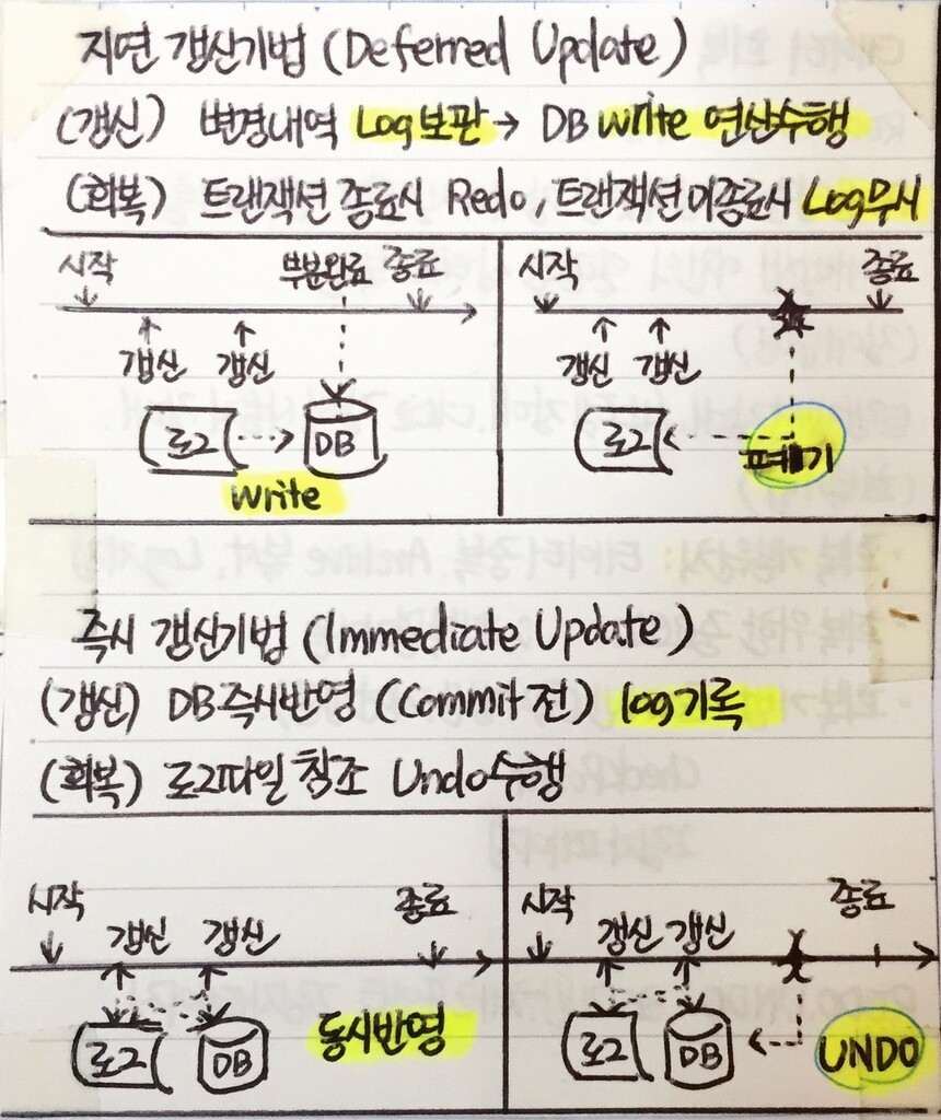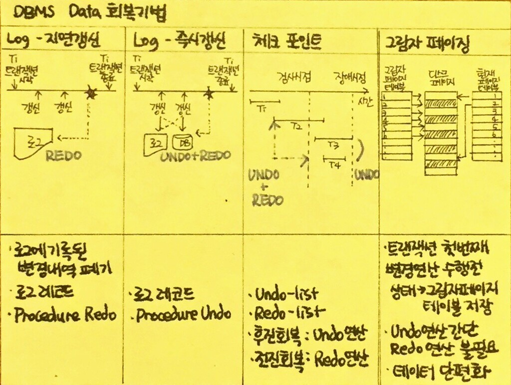 (데이터 회복기법 종류) 로그기반(지연갱신/즉시갱신), 체크포인트, 그림자 페이징