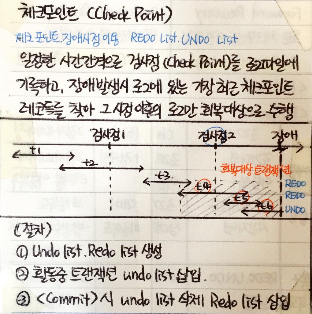 [개념] 일정한 시간 간격으로 검사점(Check Point)을 로그파일에 기록하고, 장애 발생시 로그에 있는 가장 최근 체크포인트 레코드를 찾아 그 시점 이후의 로그만을 회복대상으로 수행