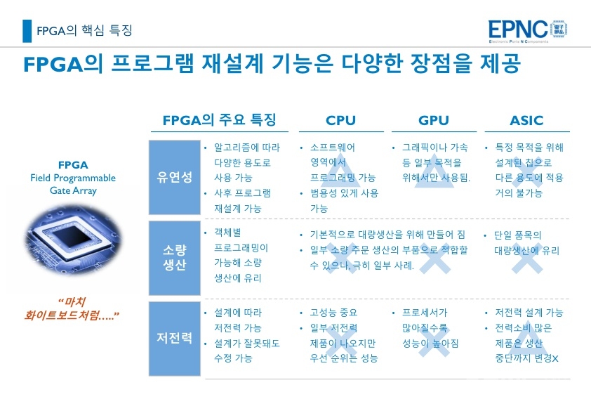 FPGA는 프로그램이 가능한 비메모리 반도체의 일종으로, 주로 항공, 우주, 방산 등의 특수한 영역이나 특정 전자 제품을 생산하기 전에 테스트용으로 사용됐다. FPGA는 회로 변경이 불가능한 일반 반도체와 달리 용도에 맞게 회로를 다시 새겨 넣을 수 있다. 최근에는 사용자의 용도에 따라 반도체의 기능을 변형시킬 수 있는 특징에 급속도로 변화하는 AI 환경에 적합한 프로세서로 새롭게 주목받고 있다.