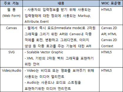 W3C(World Wide Web Consortium)을 중심으로 기존의 HTML 표준의 한계를 극복하기 위해 추가적인 플러그인 없이 리치 웹 응용을 가능하게 하는 차세대 HTML 표준