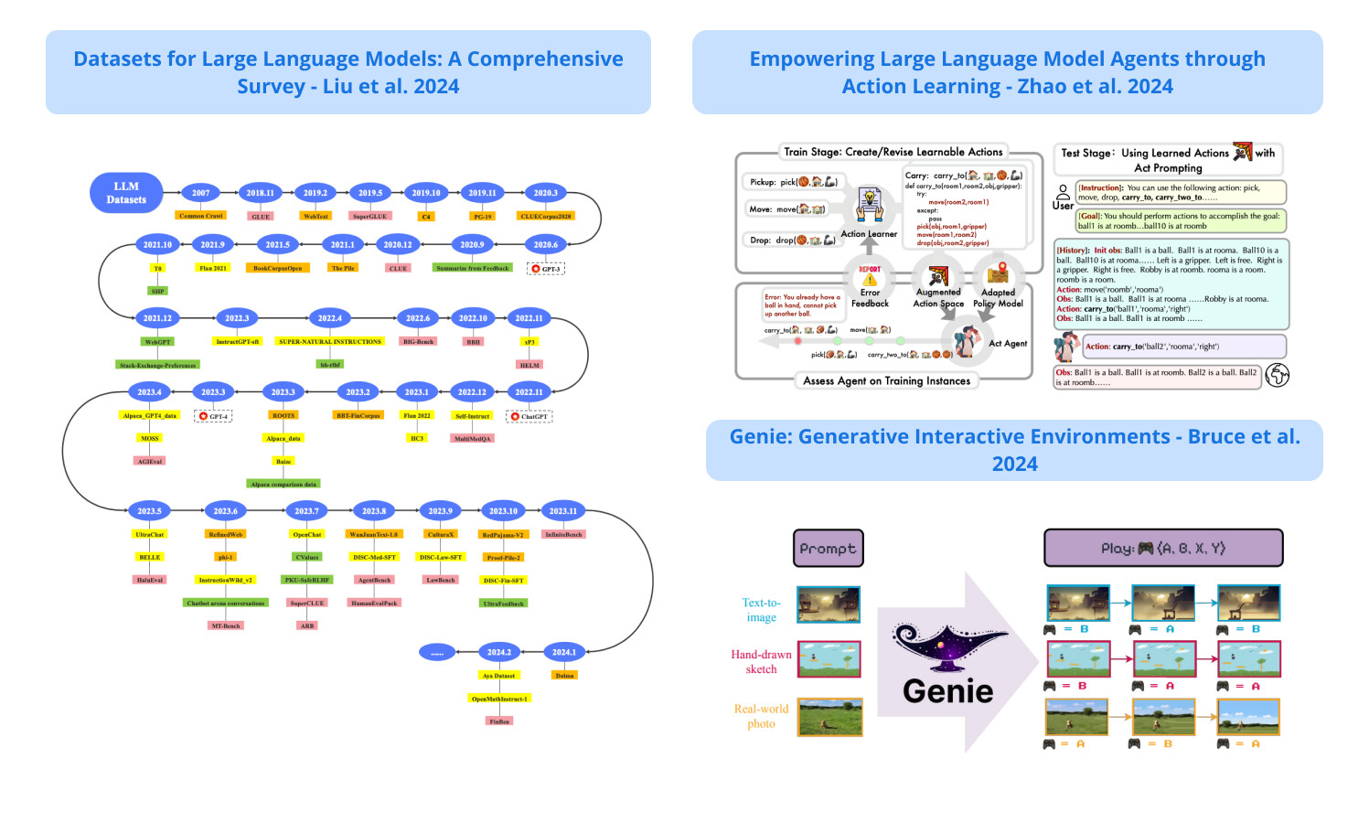 - 인터넷 동영상으로 학습되고 이미지 프롬프트가 주어지면 동작 제어가 가능한 다양한 2D 세계를 생성할 수 있는 파운데이션 모델인 지니는 11B 규모의 파라미터를 가지고 있으며 시공간 비디오 토큰화, 자동 회귀 동적 모델, 확장 가능한 잠재 액션 모델로 구성되어 있으며, 잠재 액션 공간을 통해 학습 에이전트가 보이지 않는 비디오의 동작을 모방할 수 있어 보다 일반적인 에이전트를 구축하는 데 유망합니다.A foundation model trained from internet videos and with the ability to generate a variety of action-controllable 2d worlds given an image prompt; genie has 11b parameters and consists of a spatiotemporal video tokenizer, an autoregressive dynamic model, and a scalable latent action model; the latent action space enables training agents to imitate behaviors from unseen video which is promising for building more generalist agents.