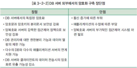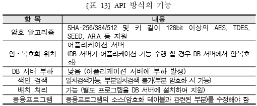 1)API방식:데이터베이스 솔루션 외부의 어플리케이션에서 데이터의 암/복화화를 수행,