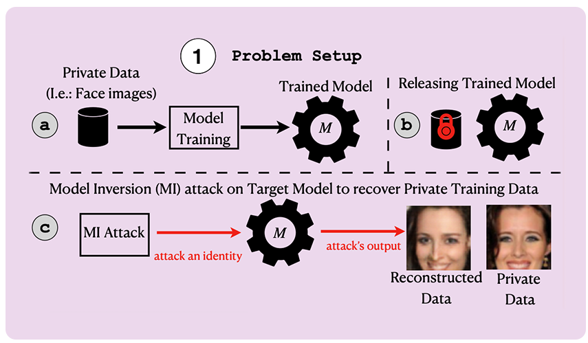 1) 모델 역공학 공격 (Model Inversion Attack) : 프라이버시 침해 의도를 가진 공격자가 공격 목표가 되는 모델에 접근해 이 모델을 훈련시킨 원 데이터를 역으로 파악하는 것입니다. 다양한 입력 데이터를 모델에 투입한 뒤 그에 따른 출력 데이터를 분석하여 패턴을 파악합니다. 이를 통해 모델이 학습한 데이터의 특징을 역으로 추정하고, 원본 데이터와 유사한 샘플을 생성해냅니다. 원 데이터에는 프라이버시 정보가 포함되어 있으므로 공격자는 결국 프라이버시와 유사한 결과를 얻을 수 있게 됩니다.