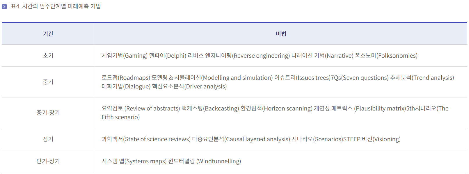 고려하는 상대적 기간에 따라 기법들이 정의될 수 있음. 표4. 시간의 범주단계별 미래예측 기법 기간, 기법을 보여주는 표 기간 비법 초기 게임기법(Gaming) 델파이(Delphi) 리버스 엔지니어링(Reverse