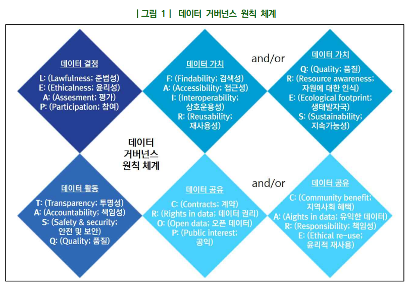 - 데이터 결정(LEAP) : 관련 거버넌스 결정은 합법적이고 윤리적이어야 하며, 신중한 평가를 거쳐야 하고, 모든 관련 이해관계자의 참여를 끌어내야 함