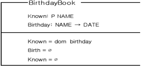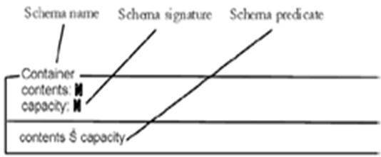 - Schema, Schema name, Schema signature(변수이름,타입정의), Schema predicate(요소들간의 관계, 항상 참인 불변조건)