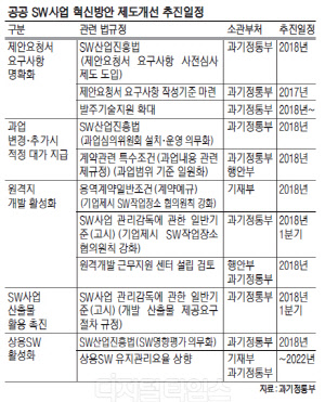 과기정통부는 혁신안 중 RFP 명확화, 과업변경 적정대가 지급, 상용SW 활성화 등은 SW산업진흥법 개정안에 반영해 내년까지 입법절차를 완료하고 2019년부터 시행할 계획이다. 원격지 개발, 산출물 활용 등은 관련 고시를 내년 1분기까지 정비할 예정이다.