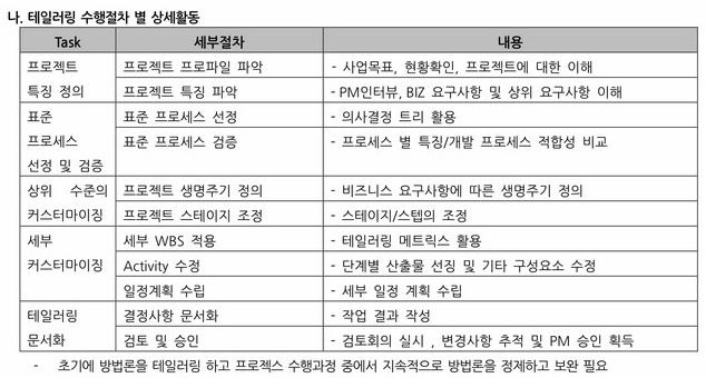 1. 기존의 개발 방법론에서 절차, 활동 및 산출물을 변경하여 프로젝트 목적 달성 하는 방법론 최적화하는 활동