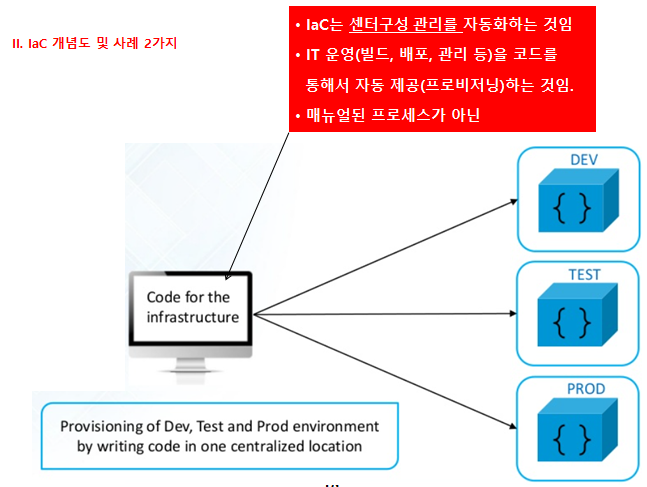 IAC는 유연성이 떨어지는 스크립팅이나 수동 프로세스 대신 코드를 이용해 시스템을 자동으로 구축, 관리, 프로비저닝 하는 IT 인프라 프로비저닝 프로세스의 일종이다. 이에 따라 IAC를 때론 '프로그래밍이 가능한 인프라'라고 부르기도 한다. 당연한 말이지만 코드가 탄탄하면 프로세스를 앞당기고 인적 실수를 없앨 수 있다.