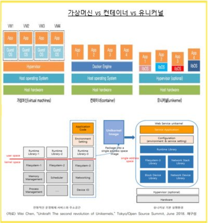 [정의] 라이브러리 운영체제로 구현된 단일 주소 공간을 가진 이미지임. 즉, 응용은 필요한 운영체제의 기능을 라이브러리 형태로 포함하여 그 이미지 자체가 해당 응용만의 특별한 커널