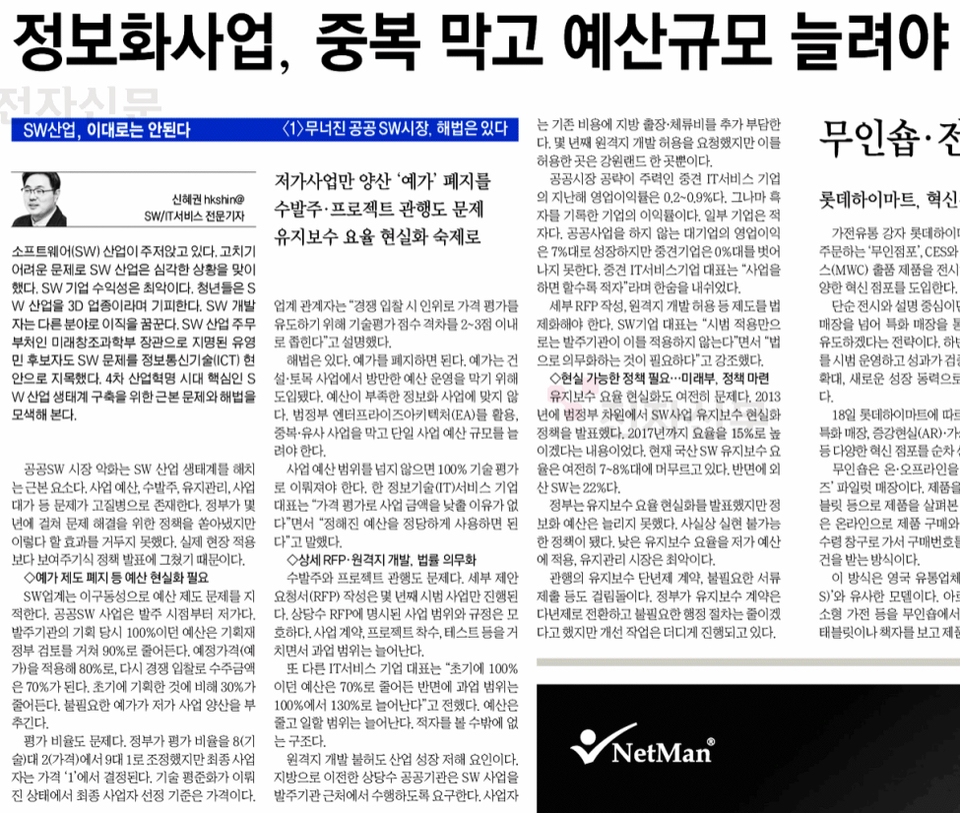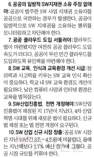 - SW개발 관리 부재(프로세스,방법론X), 처우개선필요(품질저하), SW업체 과장경쟁(가격위주 제안평가 문제)