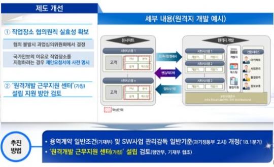 양측의 협의가 이뤄지지 않을 경우 과업심사위원회에 청구할 수 있게 했고, 발주자가 국가안보 등의 이유로 작업 장소를 지정하려는 경우 미리 제안요청서에 명시하도록 했다. 또, 원격 개발 근무지원 센터를 설립해 지원하는 방안도 검토 중