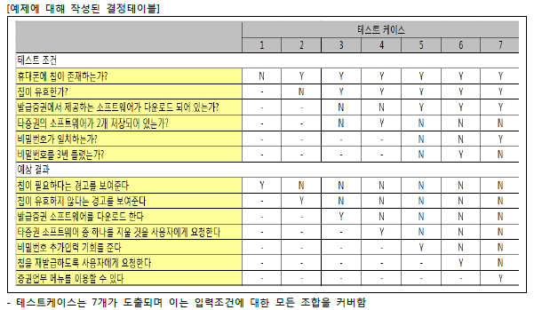 요구사항의 논리와 발생 조건에 따라서 생성될 수 있는 결과를 테이블의 형태로 나열하여,