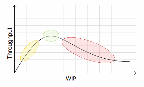 WIP가 늘어나면 팀이 최대 가용 처리량(초록색 영역)에 도달하기 전까지 업무를 최적화하고 출시 프로세스의 낭비를 제거하게 만들 수 있다.(노란색 영역) 그 이후에도 WIP가 계속 늘어난다면 더 이상의 개선이 이루어지긴 어렵다. 오히려 스트레스와 작업 전환으로 인해 팀의 처리량이 감소할 것이다.(빨간색 영역)