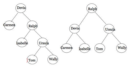 - 오른편 서브트리의 노드값(키)은 해등 트리보다 크거나 같다