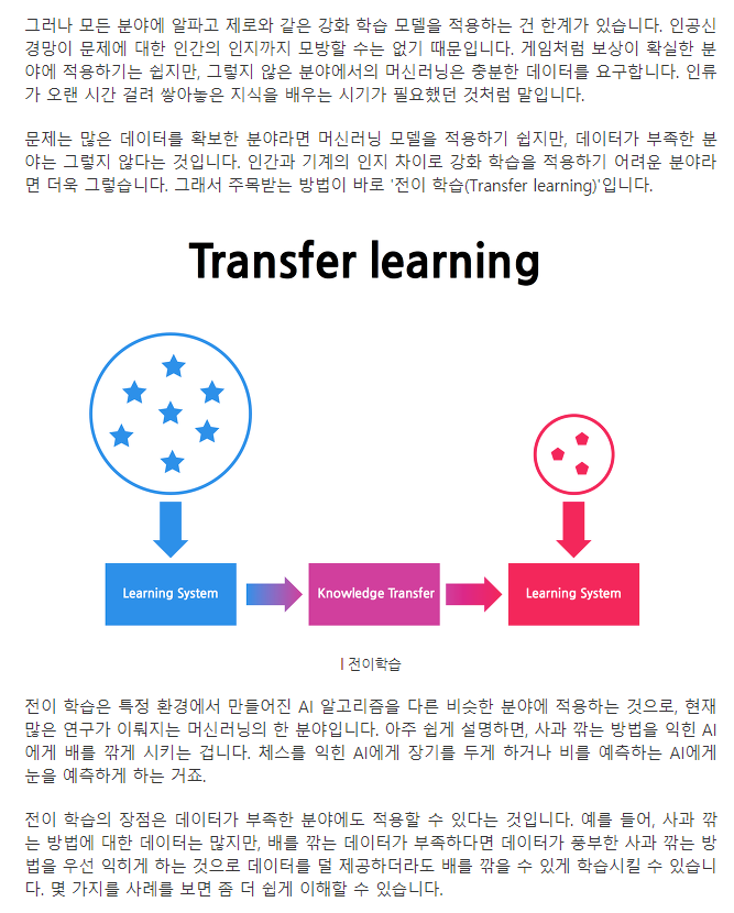 전이학습을 잘못 적용할 경우 학습 성능이 저하되는 네거티브 전이(Negative Transfer) 현상*이 발생한다. 아직까지 전이학습을 실제 응용문제에 적극적으로 적용할 수는 없지만, 전이학습의 가능성을 고려할 때 적극적인 연구가 필요한 분야임에 틀림없다.