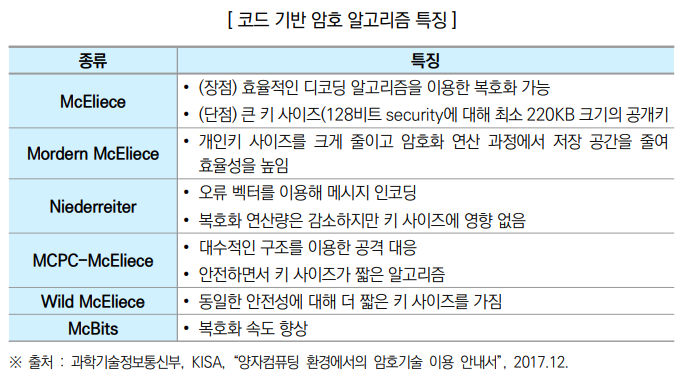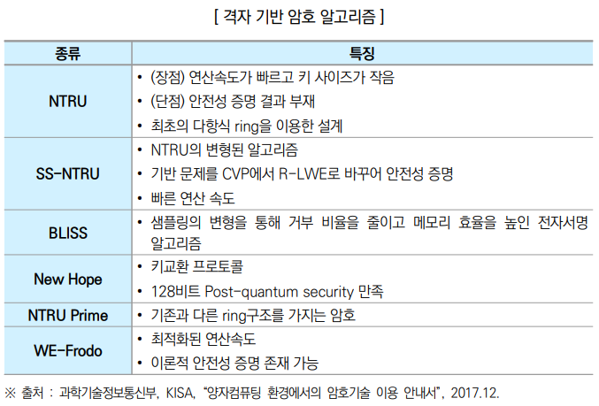 (개념) 양자컴퓨팅 환경에서 안전하게 암호기술을 이용할수 있도록 기존과 다른 새로운 수학적 난제에 기반한 암호