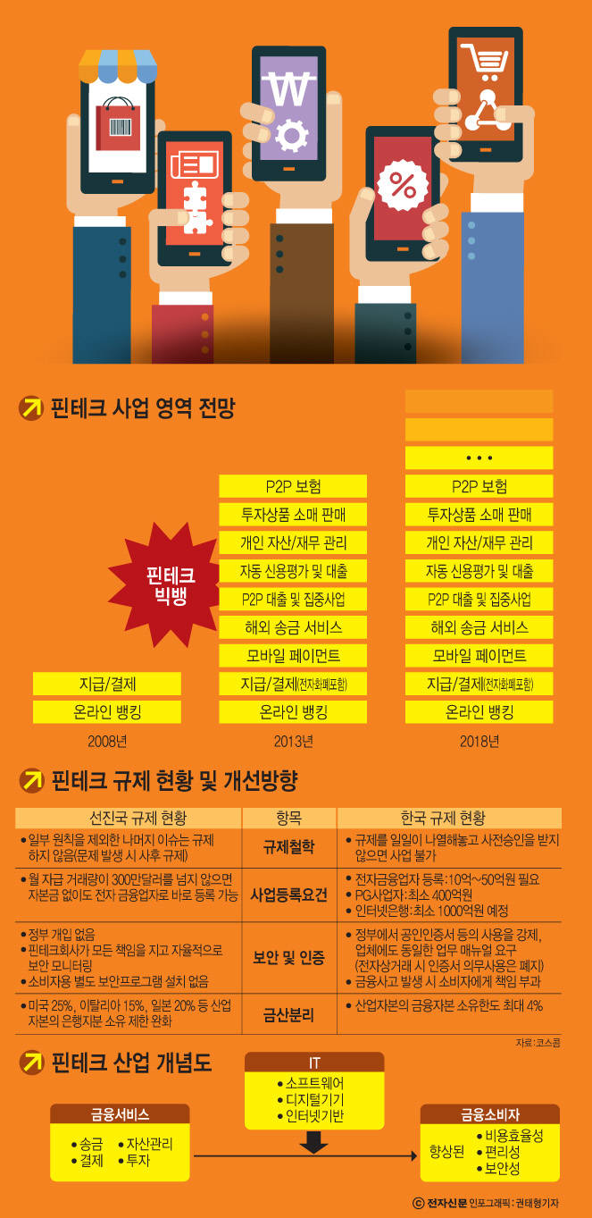 핀테크는 새로운 기술이 아니다. 형태를 달리해가며 존재해왔을 뿐 탄생한 시점은 금융 서비스와 같다고 봐도 된다. 그러나 2008년 글로벌 금융 위기 이후 급부상하면서 상거래, 결제, 투자, 자산 관리, 보험, 증권거래 청산, 나아가 비트코인과 같은 암호화 화폐를 통해 화폐 자체까지, 기존의 틀을 와해하고 새롭게 정의하고 있다.