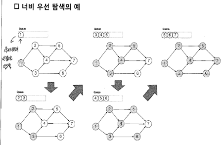 2. 큐로부터 정점을 제거(Dequeue) 함. 제거한 정점이 이웃하고 있는 인접정점 중 아직 방문하지 않은 곳들을 "방문했음"으로 표시하고 큐에 삽입