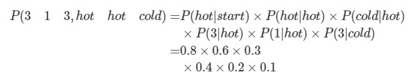 두번째 날짜를 중심으로 보겠습니다. 모델 λλ를 보면 날씨가 더울 때(hot) 아이스크림을 1개 먹을 확률은 0.2입니다. 그런데 두번째 날이 전날에 이어 계속 더울 확률은 0.6이므로 이를 곱해주어야 둘째 날의 상태확률를 계산할 수 있습니다. 여기에서 마코프 체인을 따른다고 가정하므로 상태확률을 계산할 때는 직전 상태만을 고려합니다. 위 그림을 식으로 나타내면 다음과 같습니다.