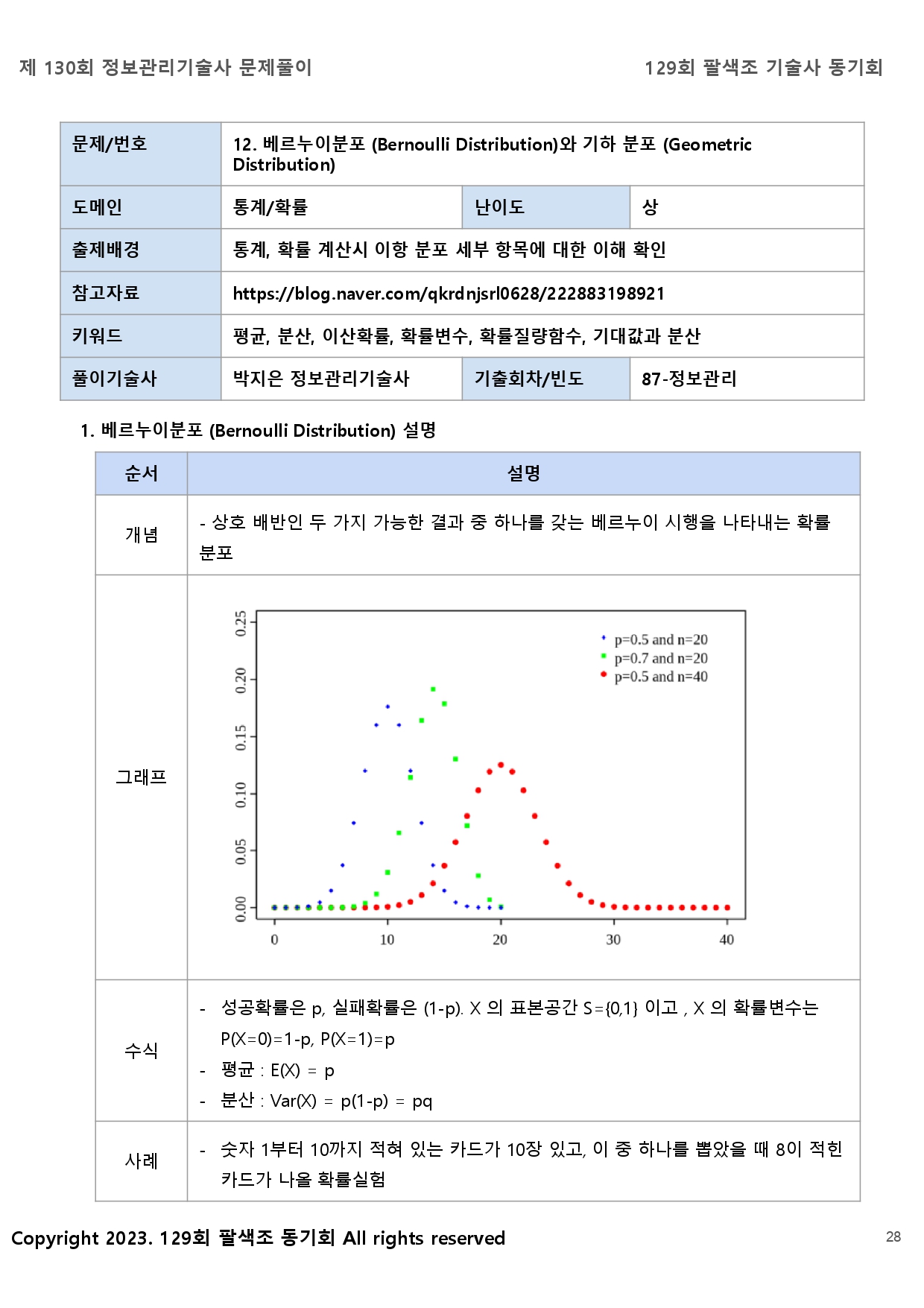 - 공통점: 두 분포 모두 베르누이 시행(성공 또는 실패 결과를 갖는 시행)에 기반합니다.
